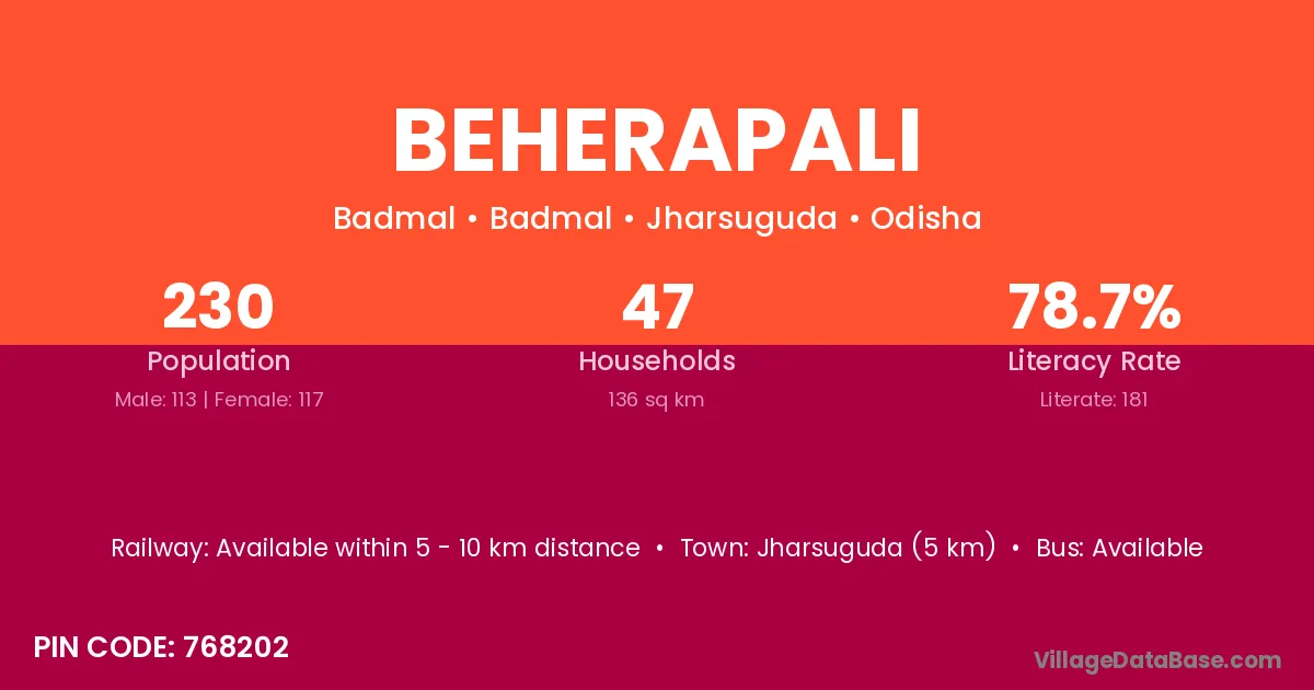 Beherapali village has a total population of 1,153 people, of which 594 are males and 559 are females.