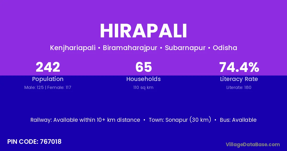 The literacy rate of Hirapali village is 71.66%. Male literacy stands at 79.31% and female literacy at 63.72%.