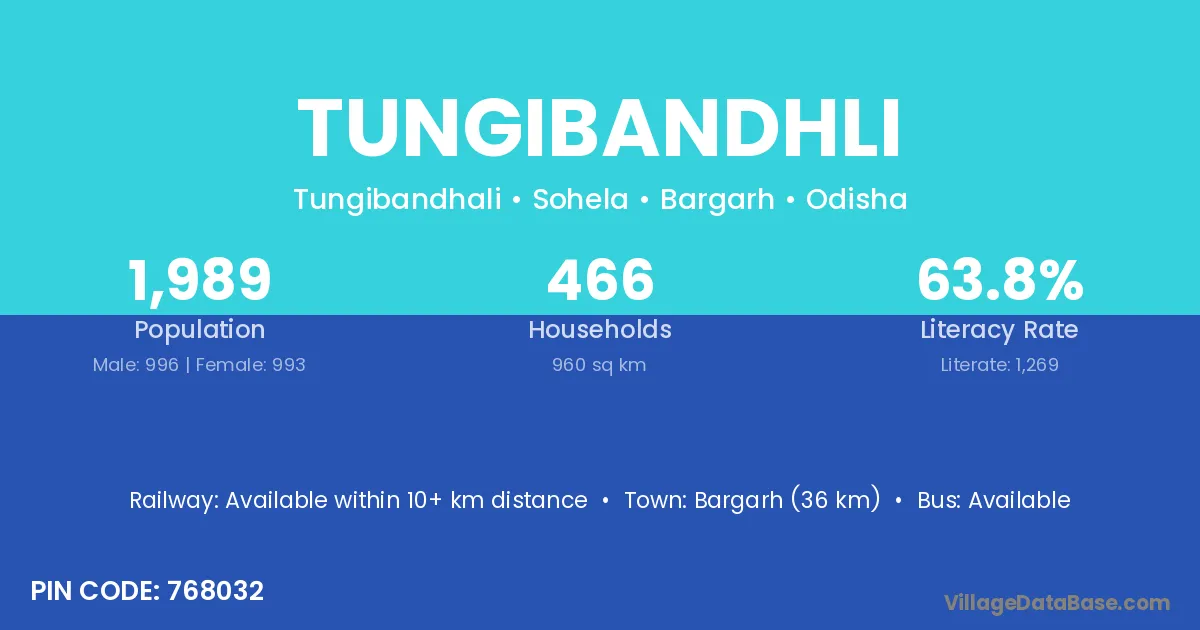 Bargarh (36 km) is the nearest town to Tungibandhli village for major economic activities and is located approximately 36 km away.