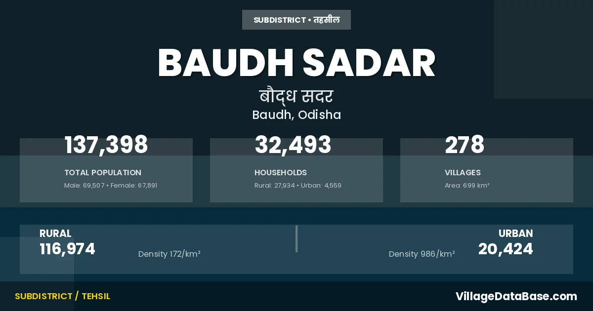 According to the 2011 census The total area of Baudh Sadar Tehsil is 699 km², with a population of 137398 people. The population density is 197 inhabitants per square kilometre, and there are approximately 32493 houses in the sub district.