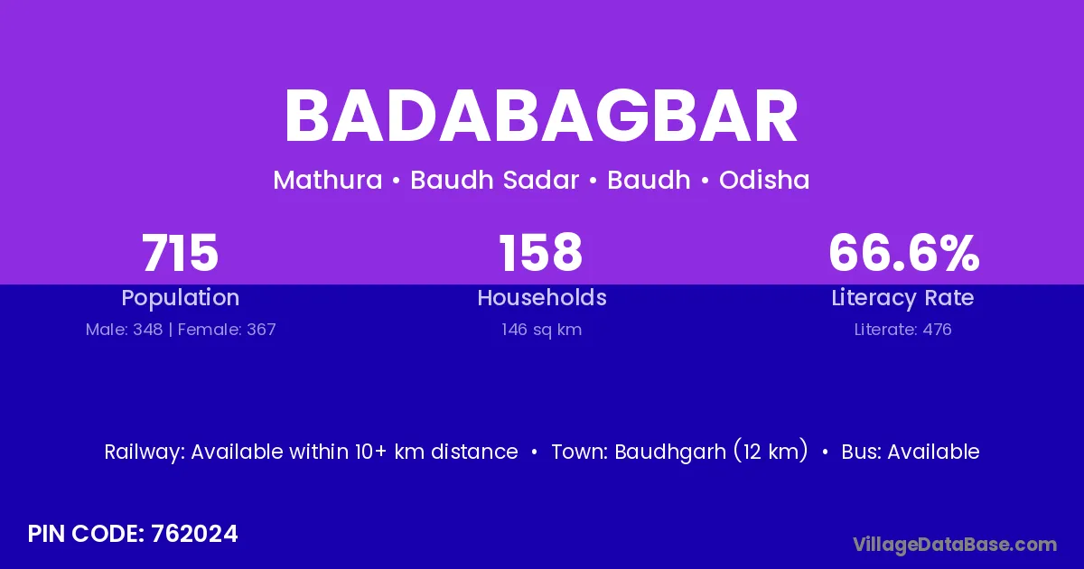 Baudhgarh (12 km) is the nearest town to Badabagbar village for major economic activities and is located approximately 12 km away.