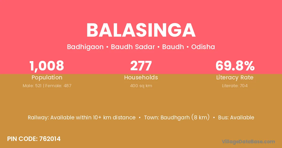 Balasinga village has a total population of 1,008 people, of which 521 are males and 487 are females.