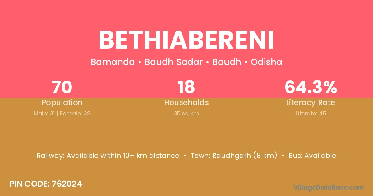 Bethiabereni village has a total population of 70 people, of which 31 are males and 39 are females.