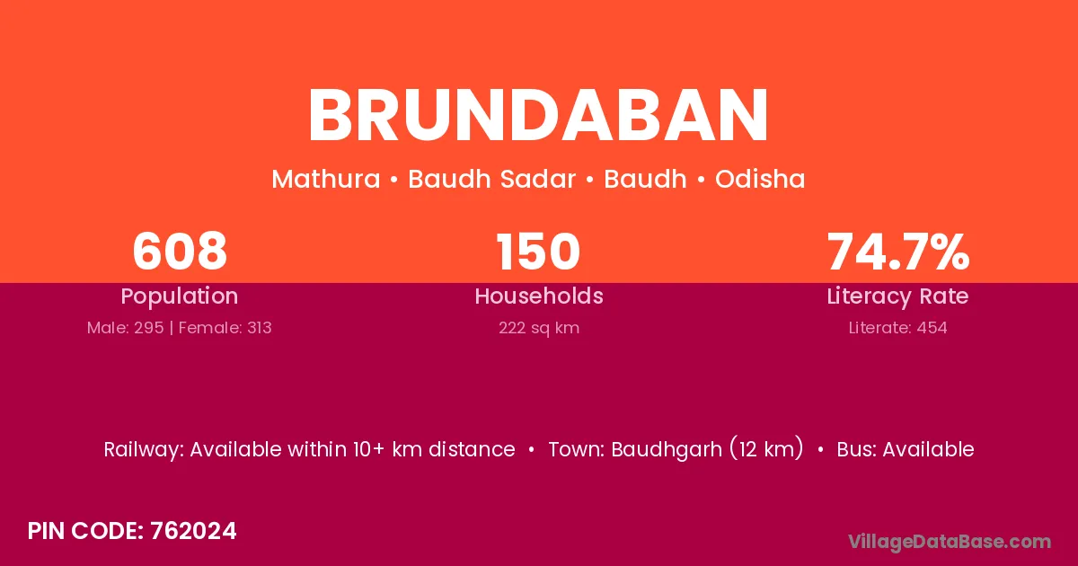 Baudhgarh (12 km) is the nearest town to Brundaban village for major economic activities and is located approximately 12 km away.