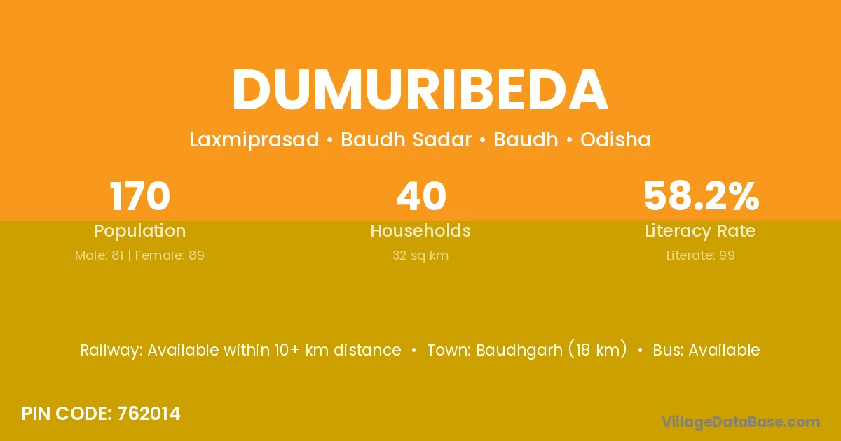 Baudhgarh (18 km) is the nearest town to Dumuribeda village for major economic activities and is located approximately 18 km away.