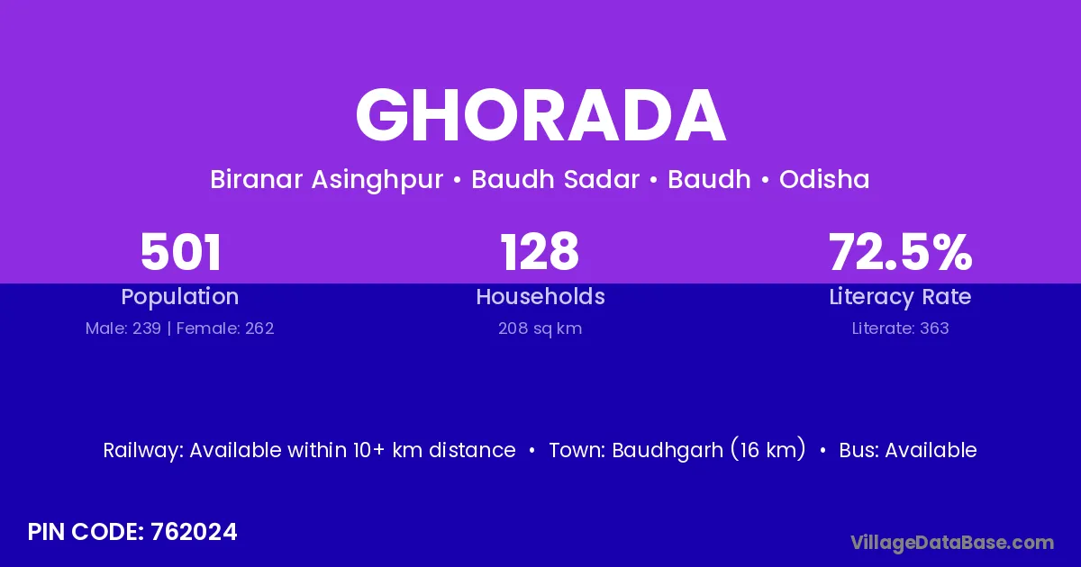 Baudhgarh (16 km) is the nearest town to Ghorada village for major economic activities and is located approximately 16 km away.