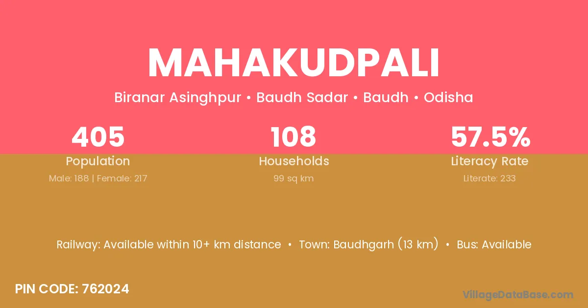 Baudhgarh (13 km) is the nearest town to Mahakudpali village for major economic activities and is located approximately 13 km away.