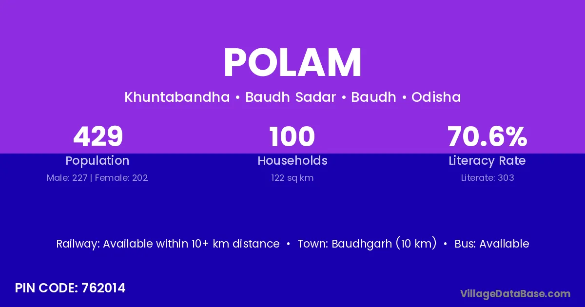 Baudhgarh (10 km) is the nearest town to Polam village for major economic activities and is located approximately 10 km away.