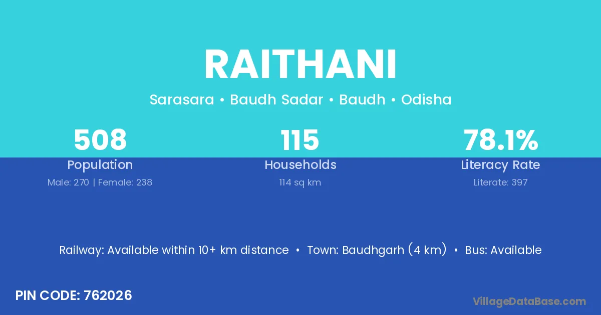 Baudhgarh (4 km) is the nearest town to Raithani village for major economic activities and is located approximately 4 km away.