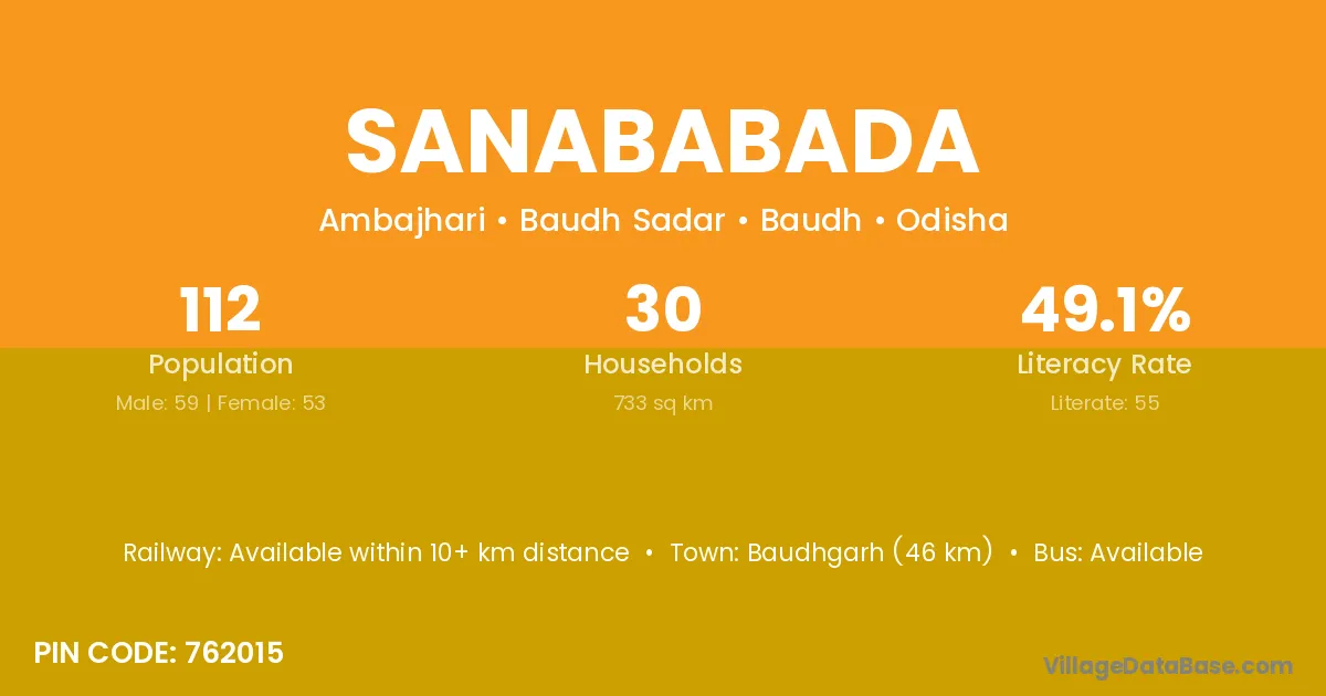 Baudhgarh (46 km) is the nearest town to Sanababada village for major economic activities and is located approximately 46 km away.