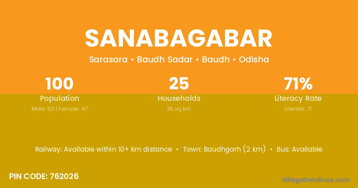 Baudhgarh (2 km) is the nearest town to Sanabagabar village for major economic activities and is located approximately 2 km away.