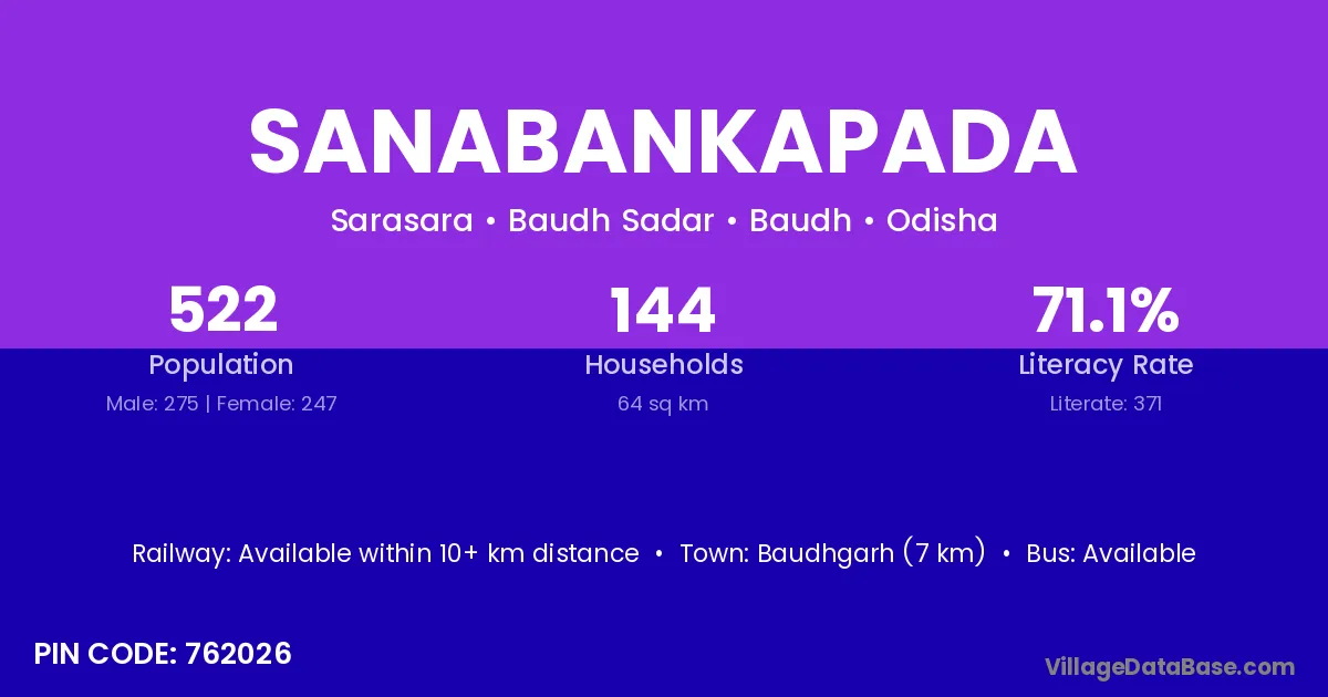 Baudhgarh (7 km) is the nearest town to Sanabankapada village for major economic activities and is located approximately 7 km away.