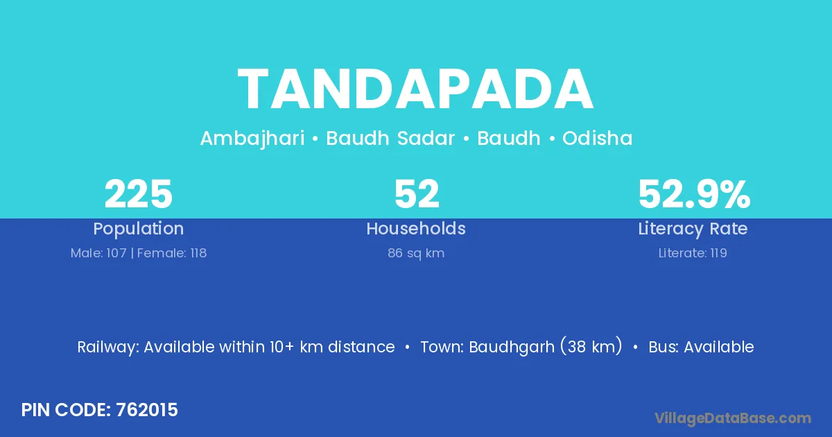 Tandapada village has a total population of 225 people, of which 107 are males and 118 are females.
