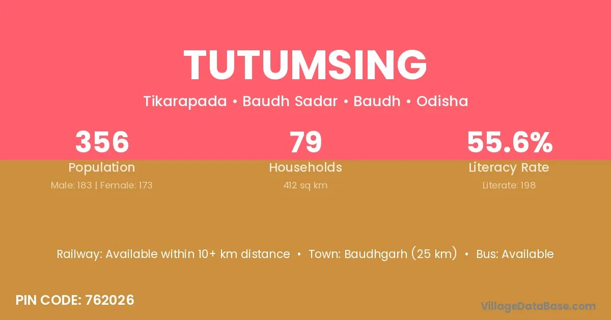 Baudhgarh (25 km) is the nearest town to Tutumsing village for major economic activities and is located approximately 25 km away.