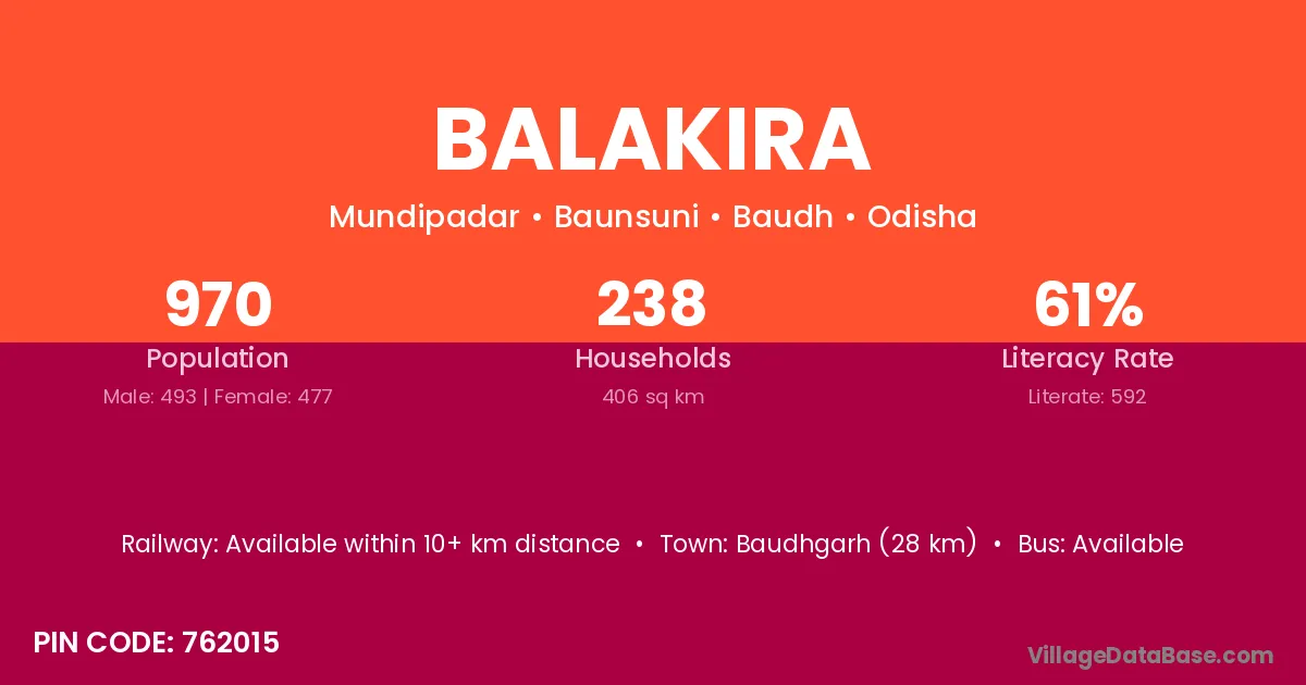 Balakira village has a total population of 970 people, of which 493 are males and 477 are females.