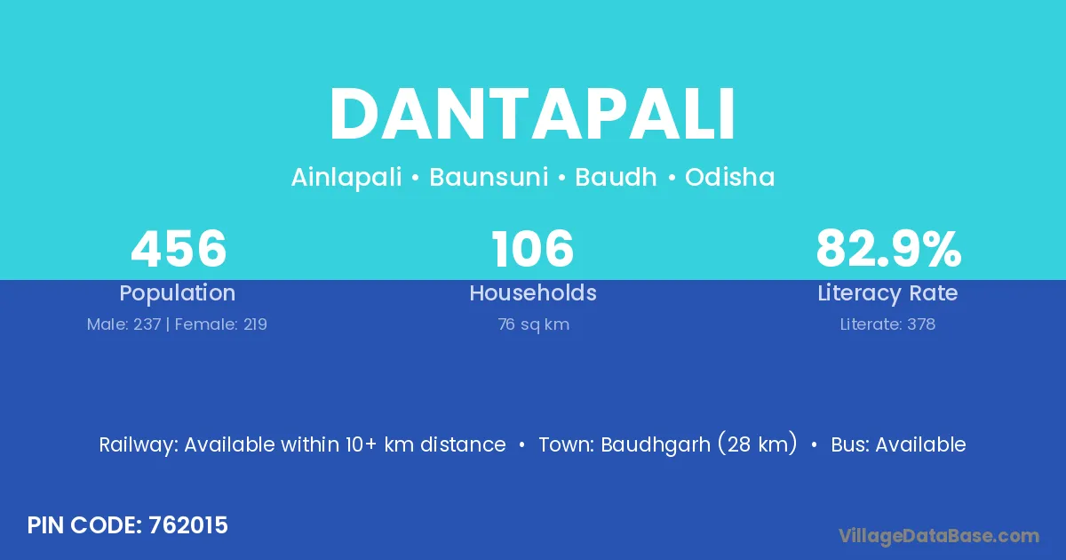 Dantapali village has a total population of 456 people, of which 237 are males and 219 are females.