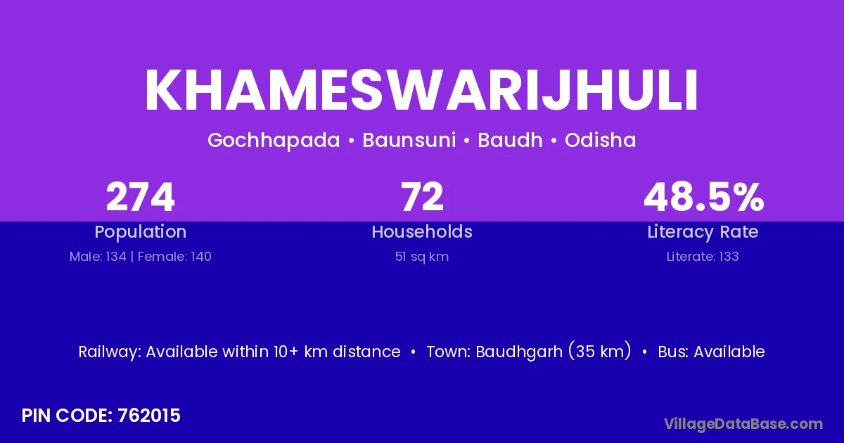 Baudhgarh (35 km) is the nearest town to Khameswarijhuli village for major economic activities and is located approximately 35 km away.