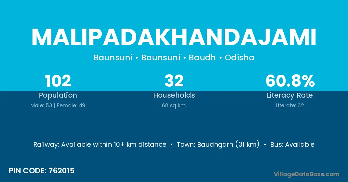 Baudhgarh (31 km) is the nearest town to Malipadakhandajami village for major economic activities and is located approximately 31 km away.