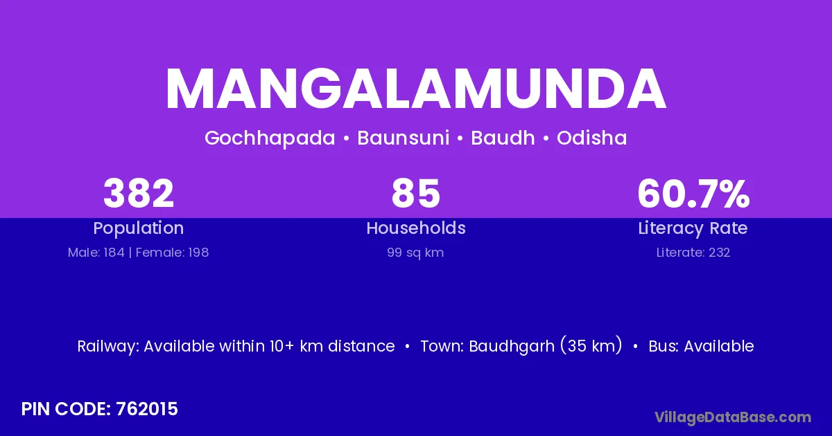 Baudhgarh (35 km) is the nearest town to Mangalamunda village for major economic activities and is located approximately 35 km away.