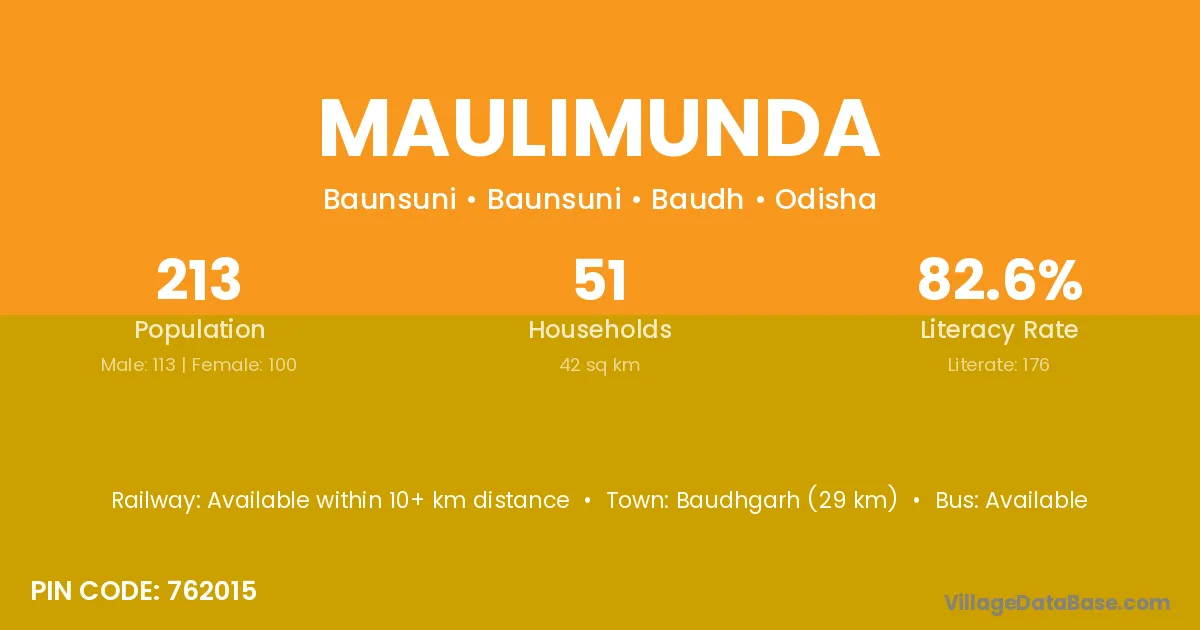 Baudhgarh (29 km) is the nearest town to Maulimunda village for major economic activities and is located approximately 29 km away.