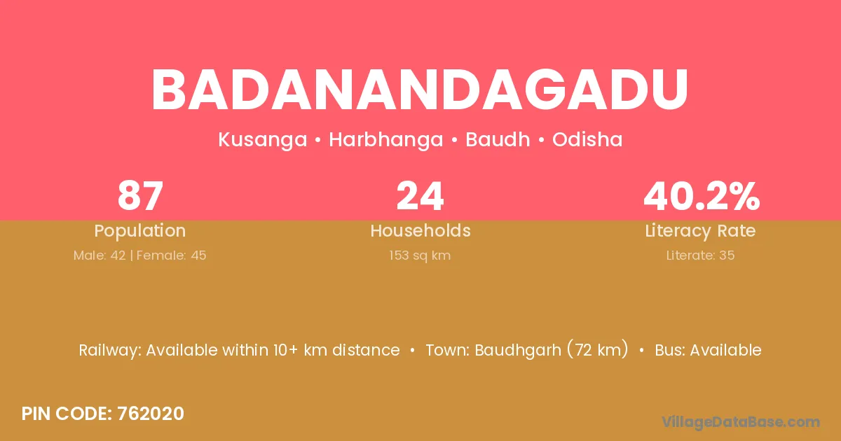 Baudhgarh (72 km) is the nearest town to Badanandagadu village for major economic activities and is located approximately 72 km away.
