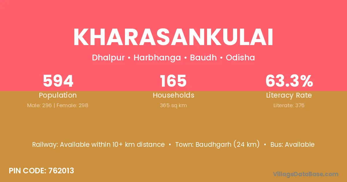 Kharasankulai village has a total population of 594 people, of which 296 are males and 298 are females.