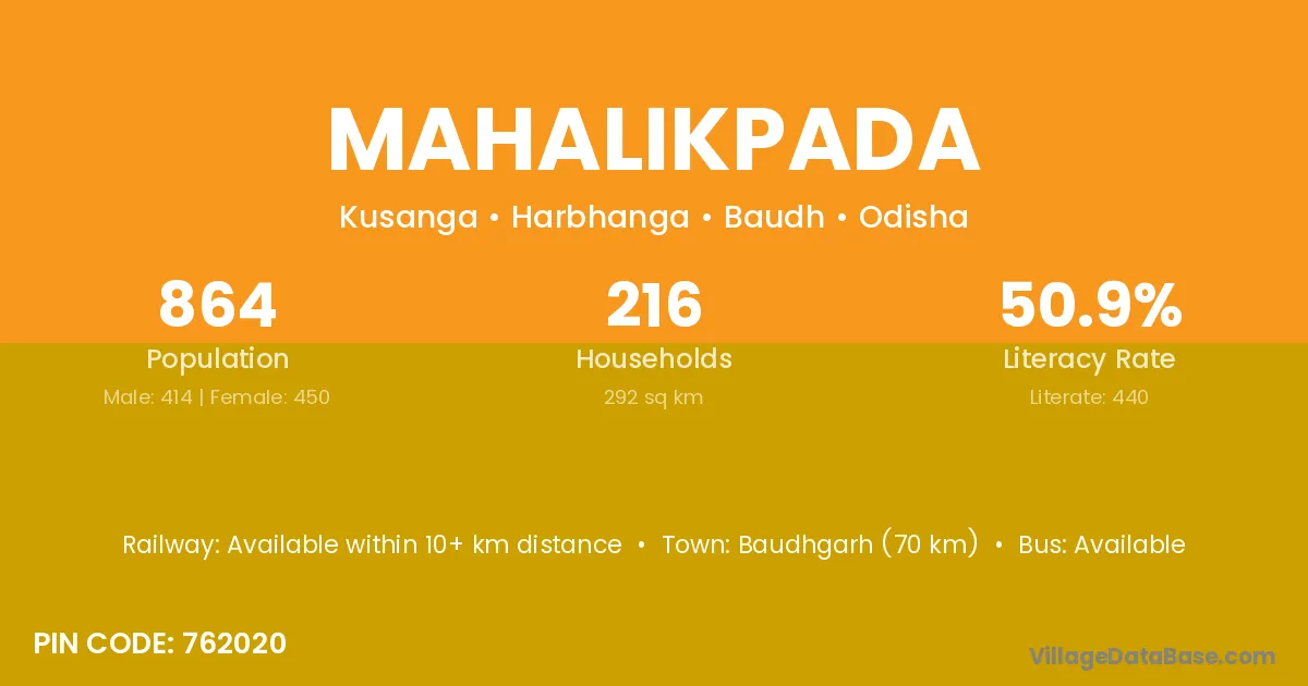 Baudhgarh (70 km) is the nearest town to Mahalikpada village for major economic activities and is located approximately 70 km away.