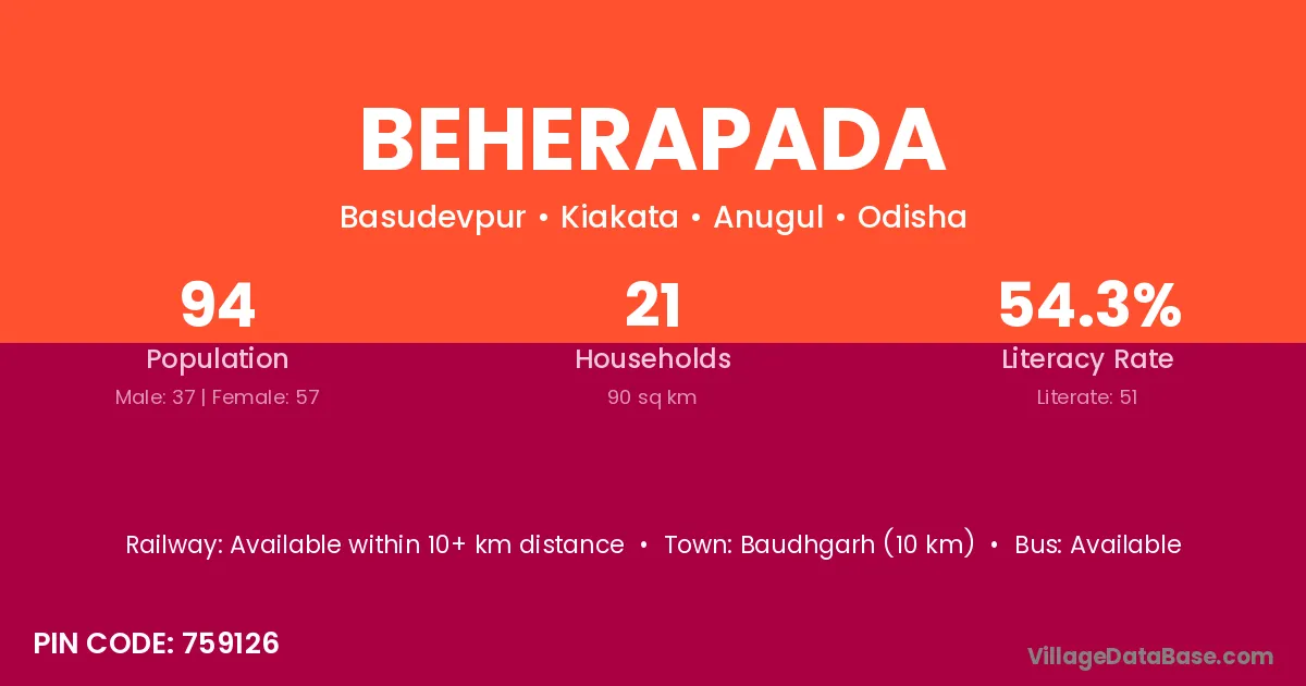 Beherapada village has a total population of 191 people, of which 102 are males and 89 are females.