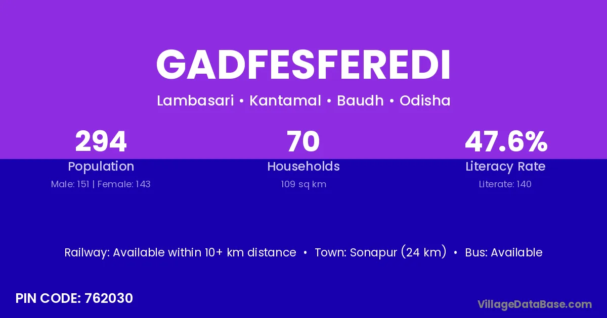 Sonapur (24 km) is the nearest town to Gadfesferedi village for major economic activities and is located approximately 24 km away.