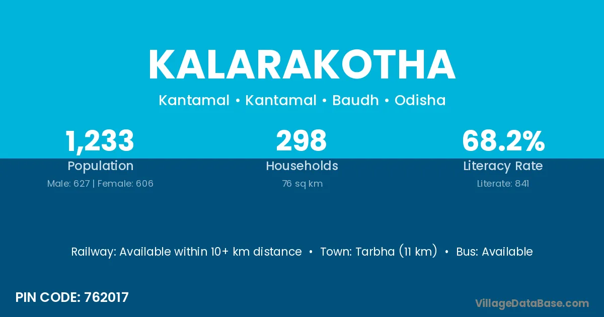Tarbha (11 km) is the nearest town to Kalarakotha village for major economic activities and is located approximately 11 km away.