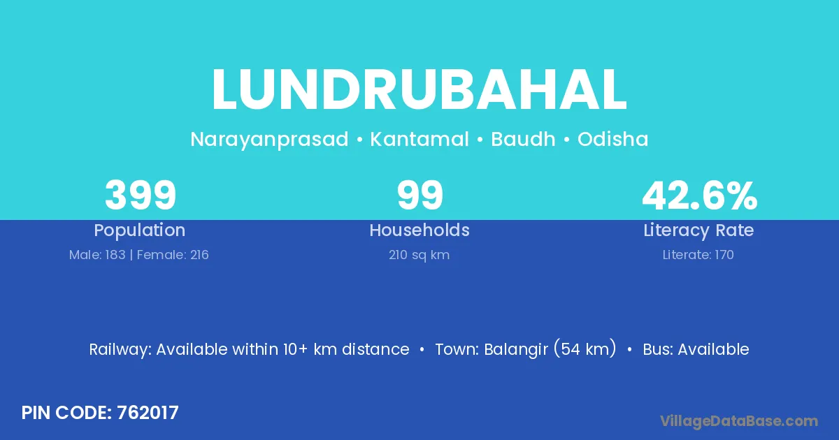 Balangir (54 km) is the nearest town to Lundrubahal village for major economic activities and is located approximately 54 km away.