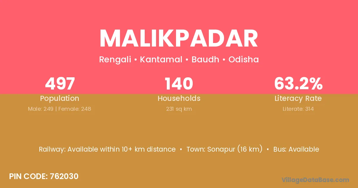 Malikpadar village has a total population of 497 people, of which 249 are males and 248 are females.