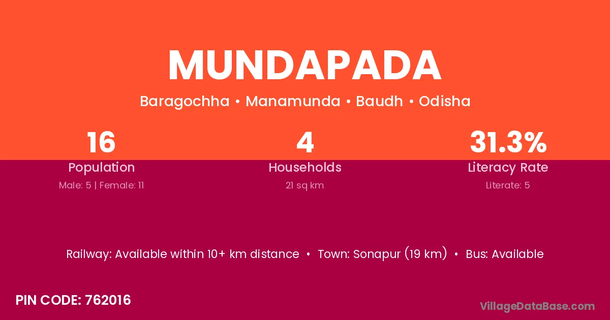 The literacy rate of Mundapada village is 34.21%. Male literacy stands at 58.82% and female literacy at 14.29%.