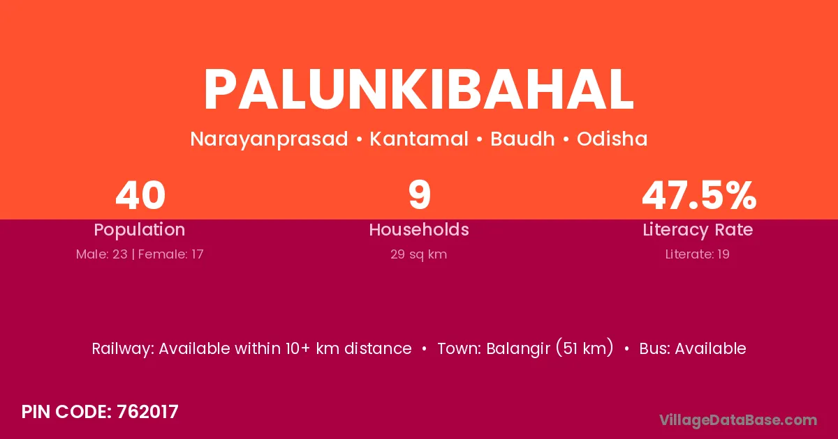 Balangir (51 km) is the nearest town to Palunkibahal village for major economic activities and is located approximately 51 km away.