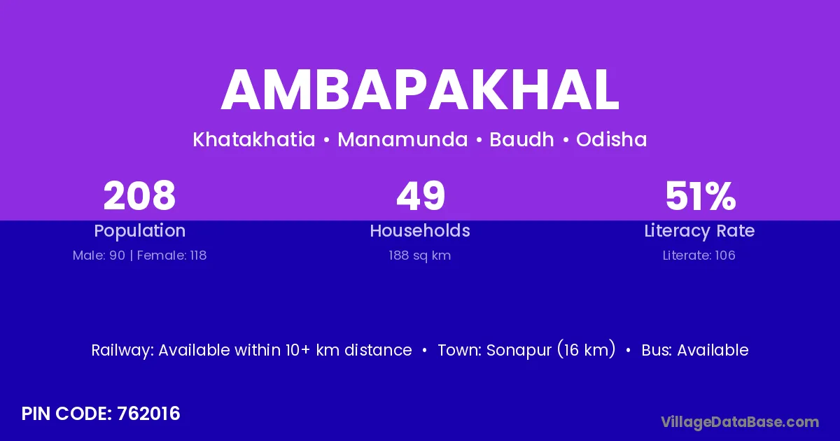 Ambapakhal village has a total population of 208 people, of which 90 are males and 118 are females.