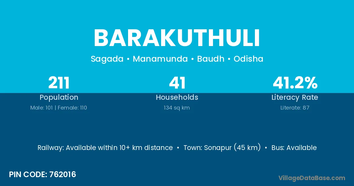 Barakuthuli village has a total population of 211 people, of which 101 are males and 110 are females.