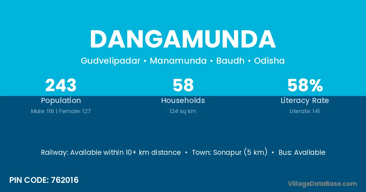 Dangamunda village has a total population of 243 people, of which 116 are males and 127 are females.