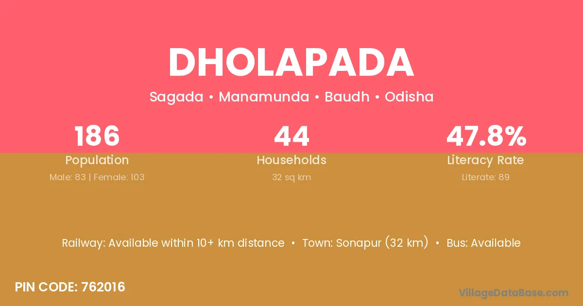 Sonapur (32 km) is the nearest town to Dholapada village for major economic activities and is located approximately 32 km away.