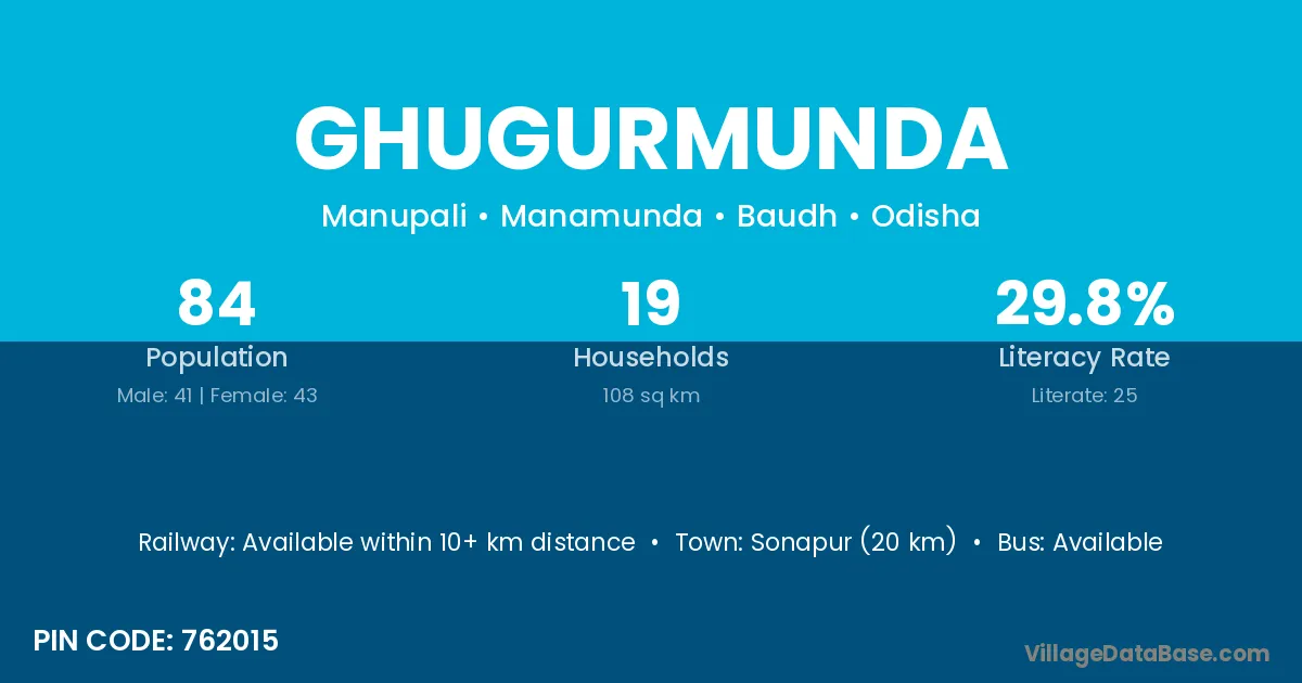 Ghugurmunda village has a total population of 84 people, of which 41 are males and 43 are females.
