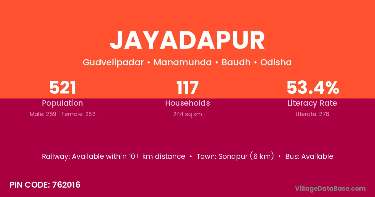 Jayadapur village has a total population of 521 people, of which 259 are males and 262 are females.