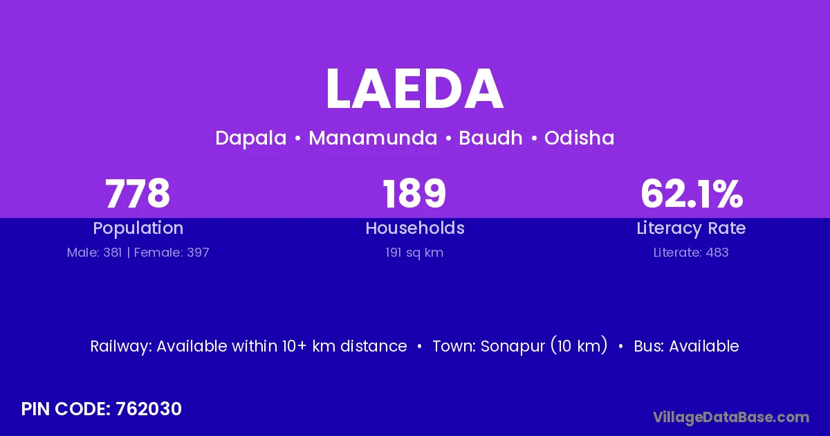 According to Census 2011 information, the village code of Laeda village is 762030.