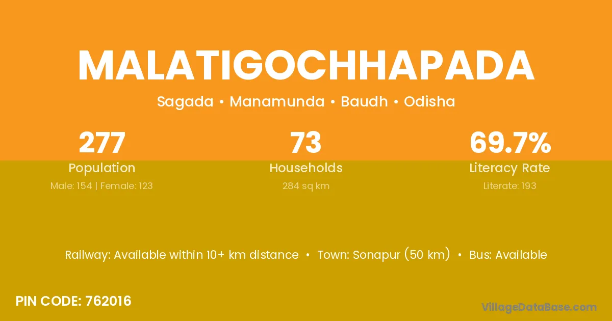 According to Census 2011 information, the village code of Malatigochhapada village is 762016.