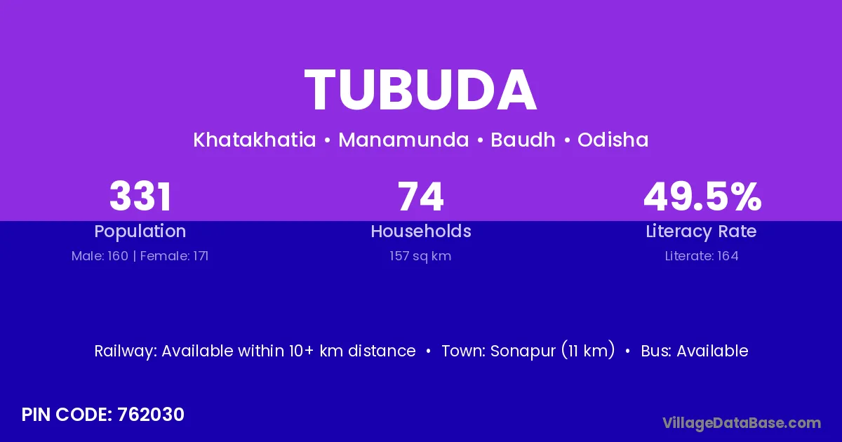 Tubuda village has a total population of 331 people, of which 160 are males and 171 are females.