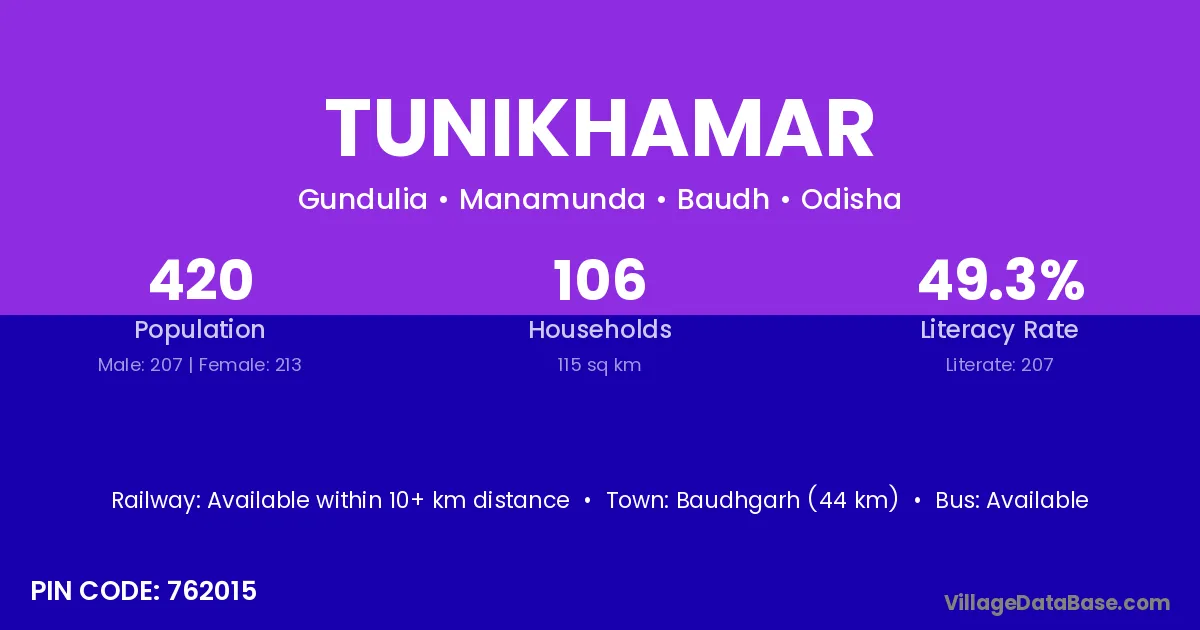 Baudhgarh (44 km) is the nearest town to Tunikhamar village for major economic activities and is located approximately 44 km away.