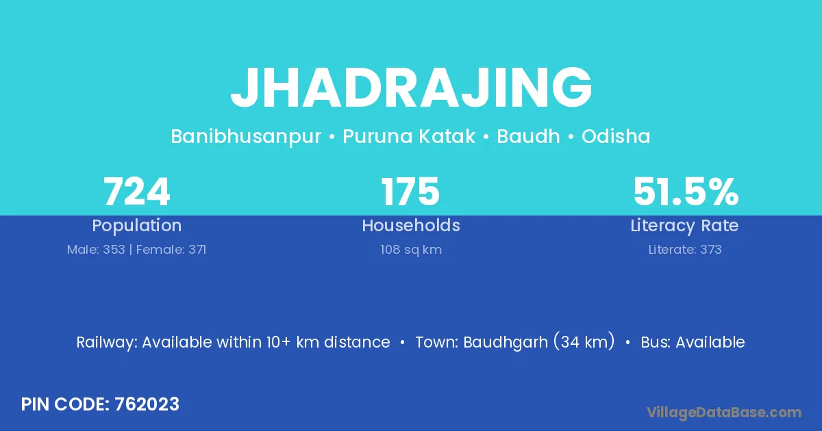 Baudhgarh (34 km) is the nearest town to Jhadrajing village for major economic activities and is located approximately 34 km away.