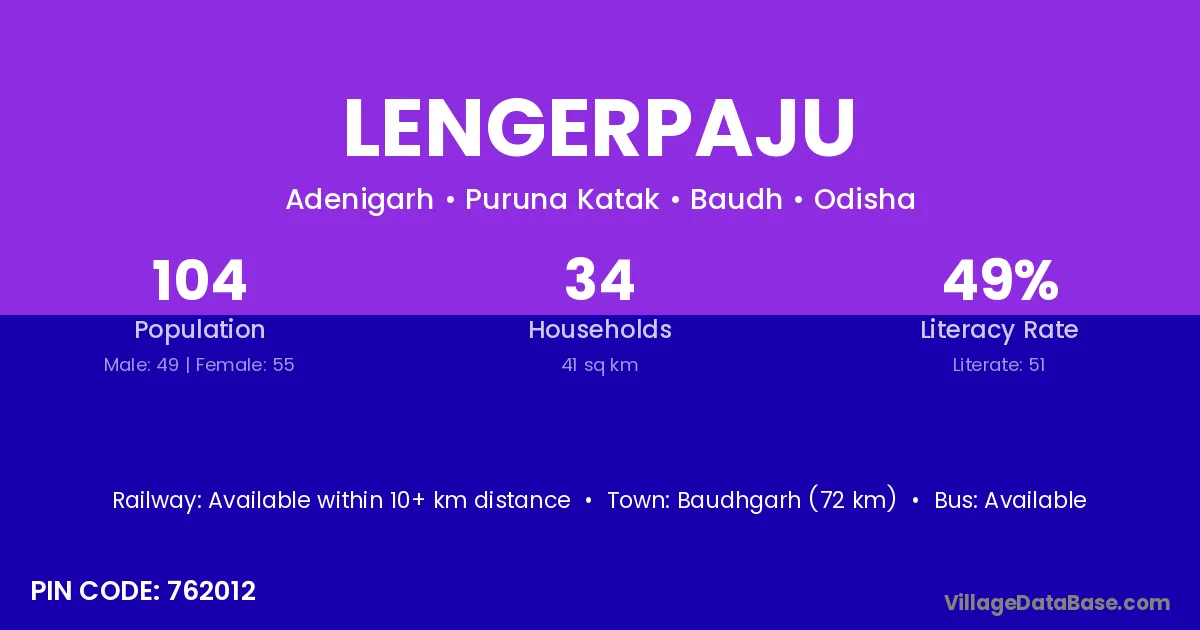 Baudhgarh (72 km) is the nearest town to Lengerpaju village for major economic activities and is located approximately 72 km away.