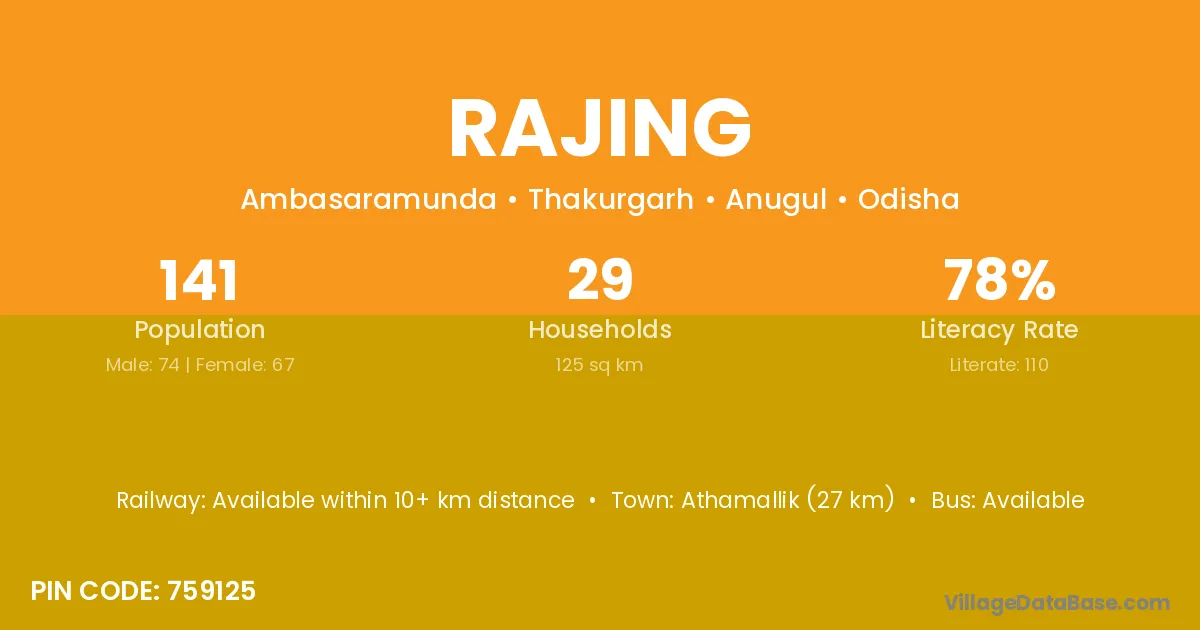 Baudhgarh (31 km) is the nearest town to Rajing village for major economic activities and is located approximately 31 km away.
