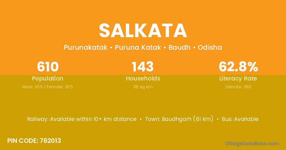 Salkata village has a total population of 610 people, of which 305 are males and 305 are females.