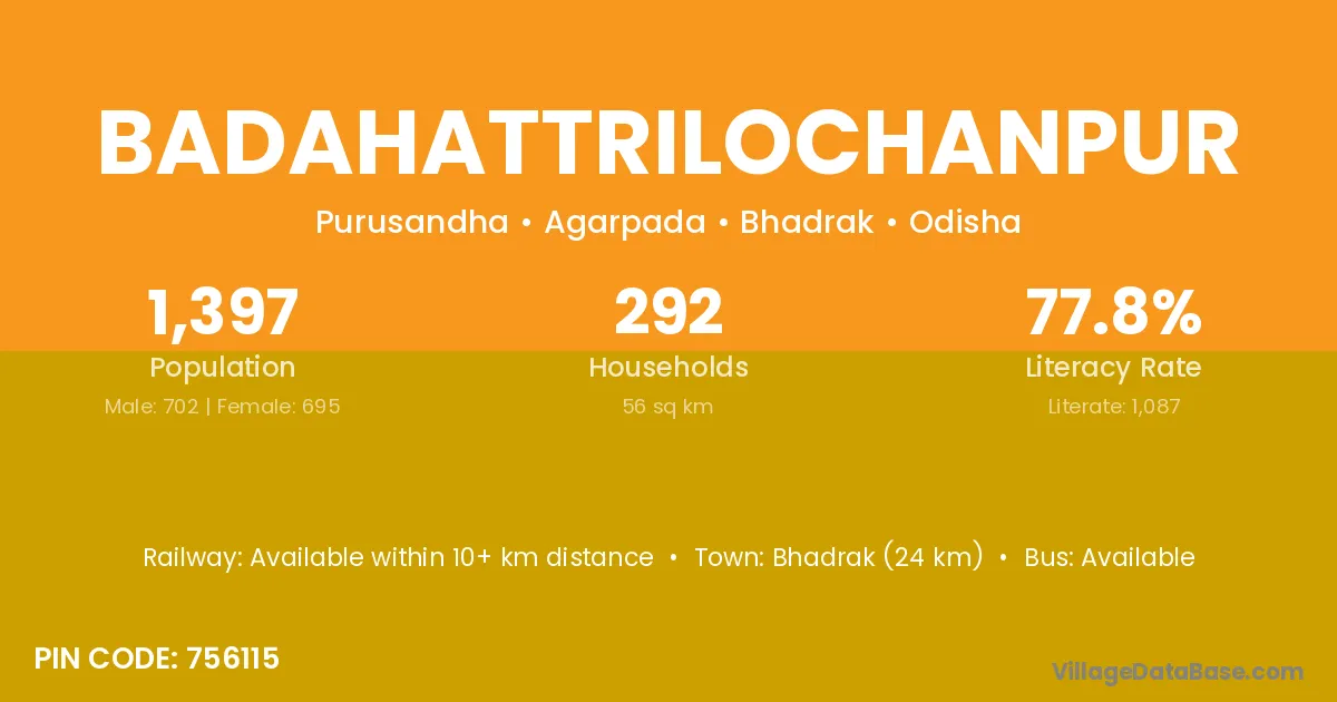 Bhadrak (24 km) is the nearest town to Badahattrilochanpur village for major economic activities and is located approximately 24 km away.