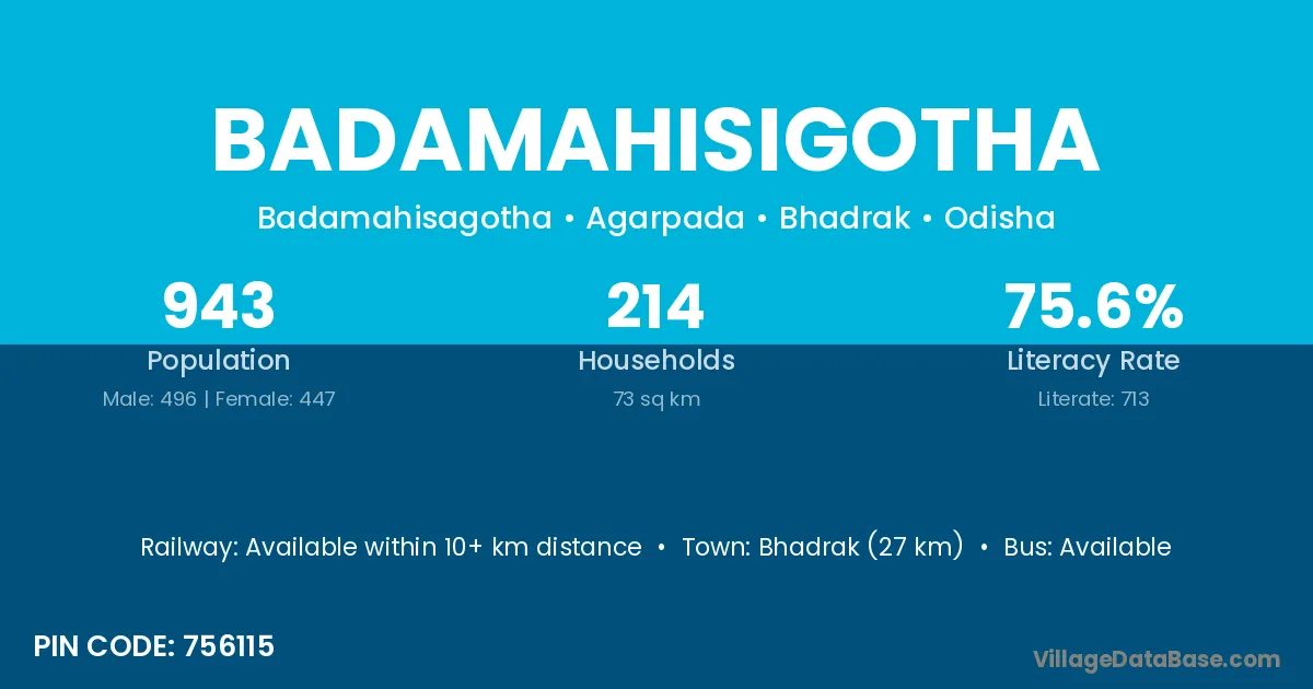 Bhadrak (27 km) is the nearest town to Badamahisigotha village for major economic activities and is located approximately 27 km away.